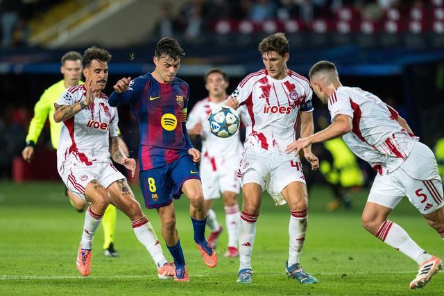 10月21日,巴塞罗那队球员佩德里(左二)在比赛中进攻。当日,在2025-2026赛季欧冠联赛阶段第三轮比赛中,西甲巴塞罗那队主场6比1战胜希腊奥林匹亚科斯队。新华社发(胡安·戈萨摄)